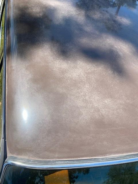 The body of the W115 Mercedes is overall in good condition. There are a couple of very small dings in the body (see photo). The window seals are sun damaged and in need of replacement. I have not appreciated a significant leak but can tell that some moisture is getting in and the seals are old. The paint on the vehicle has been heavily oxidized from the sun and it would benefit from being repainted. There a couple of very small chips in the paint on the hood of the vehicle. When I purchased the vehicle, there was some rust in the trunk from a leak in the seal. I since replaced the trunk seal, removed the rust, and repainted the trunk (see photos).