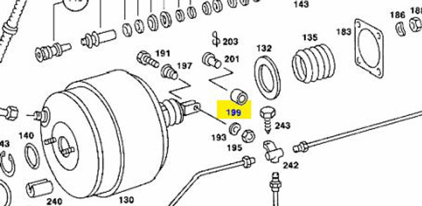 The original brake booster for some W108 W109 W111 W112 W113 models is 000-430-55-30, which is no longer available, but you can use 002-430-68-30 in its place. However you must also install this bushing and swap the vacuum fitting from the old booster to the new one.