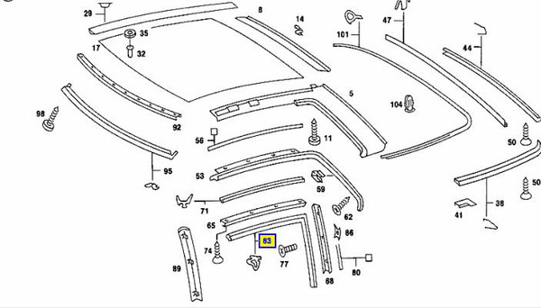 New OEM Mercedes Metal Channel for the L shaped Weatherstrip Seal that goes between the door glass and the hard top.This metal channel is on the vertical part of the hard top where it meets the rear...