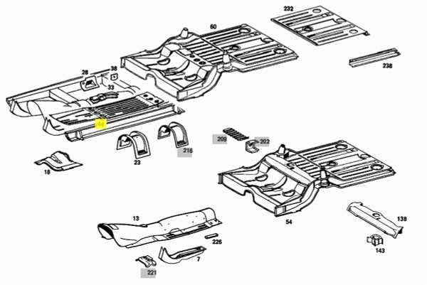 New OEM Mercedes Floor Pan for the Right (USA Passenger's) Side. This floor pan covers the area from the firewall to the base of the rear passenger seat.These are the early-style floor pans found only before 1966. If you have a 1965 or 1966 model, please contact us with your VIN to verify fitment before purchasing.