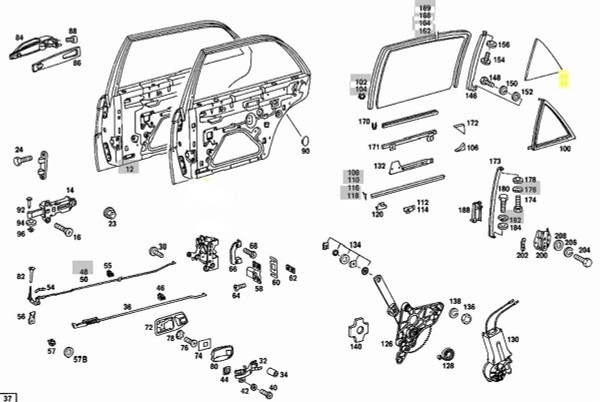 New OE Mercedes Quarter Glass Window Pane for the Rear Left (USA Driver's) Door.