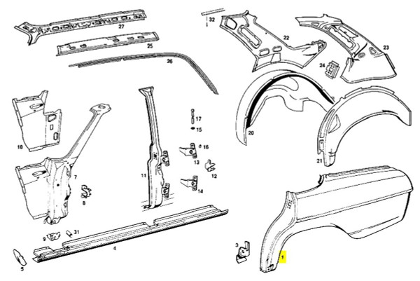 New OEM Mercedes Rear Left (USA Driver's) Quarter Panel. This is the 1973-1976 style quarter panel that mates with the larger bumper.