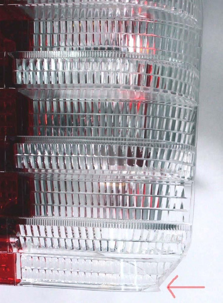 New OEM Mercedes Rear Tail Lamp Lens for the Left (USA Driver's) Side. This unit has one small chip and a crack in the lower right inside corner.