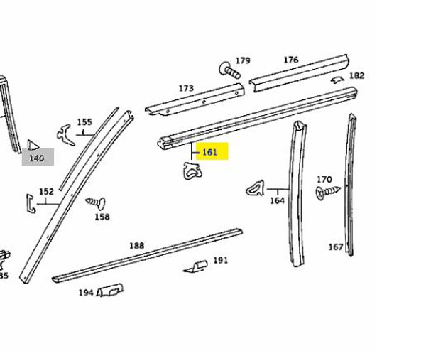 New OEM Mercedes Rubber Weatherstrip Seal for the Top of the Front Left (USA/Germany Driver's) Window. This is the seal between the door glass and the soft top. Fits R107 Chassis, not compatible with...